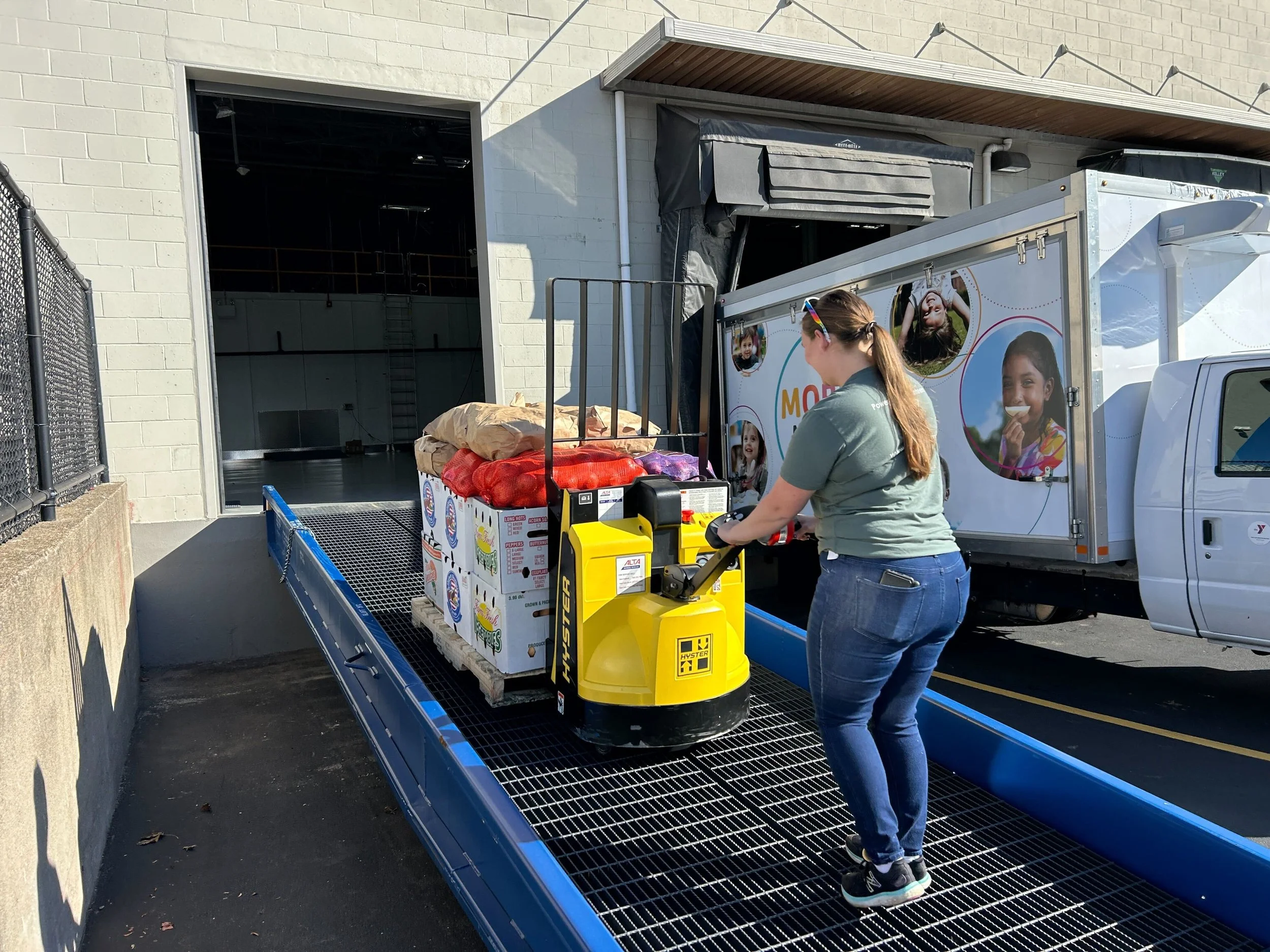 Image Description: Food Link Roxbury Logistics Manager Meghan pushes a pallet of produce up a ramp at the GBCFAH loading dock.