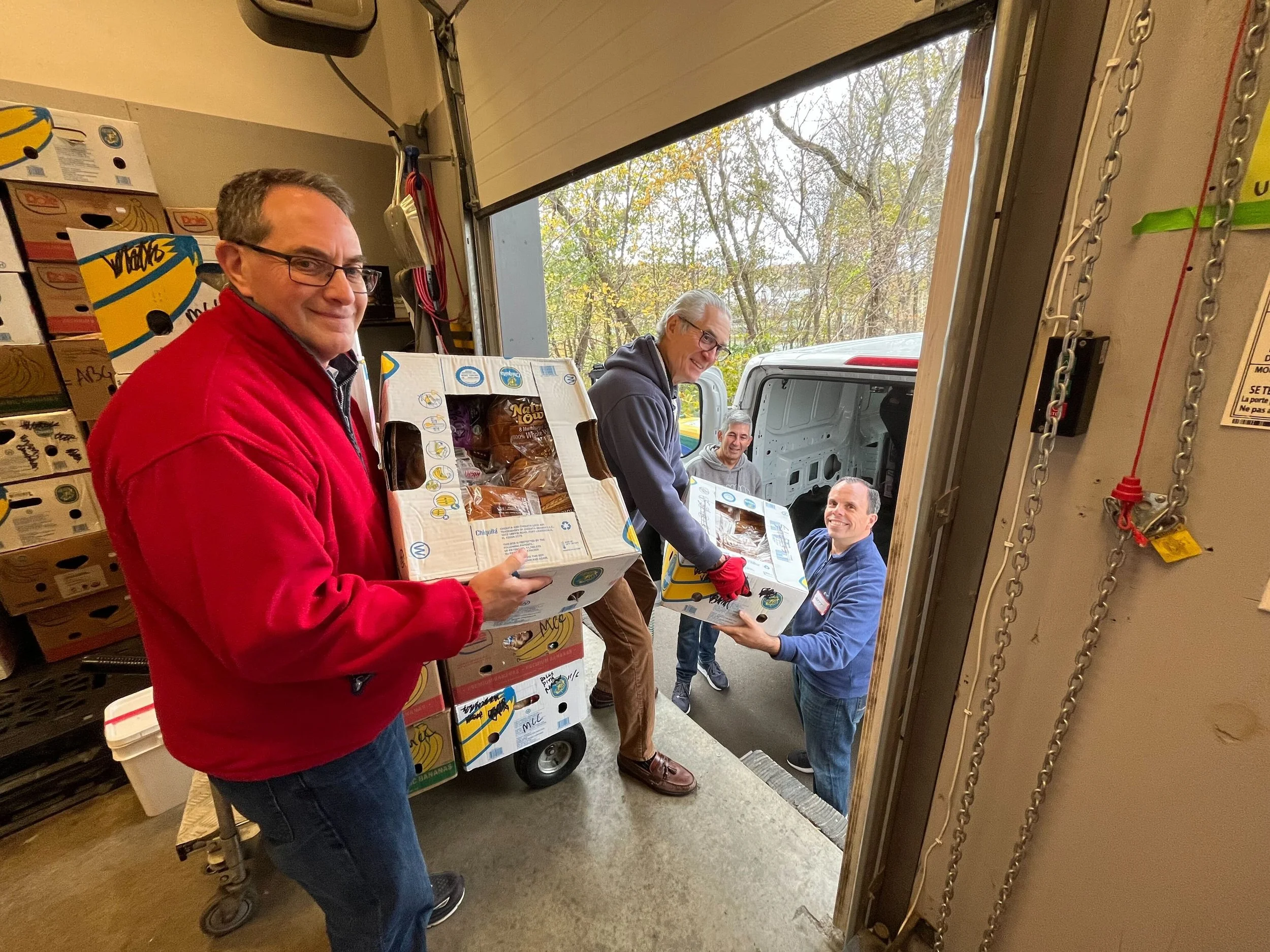 Image Description: Volunteers pose as they load bread onto a van from the Food Link Hub loading dock.