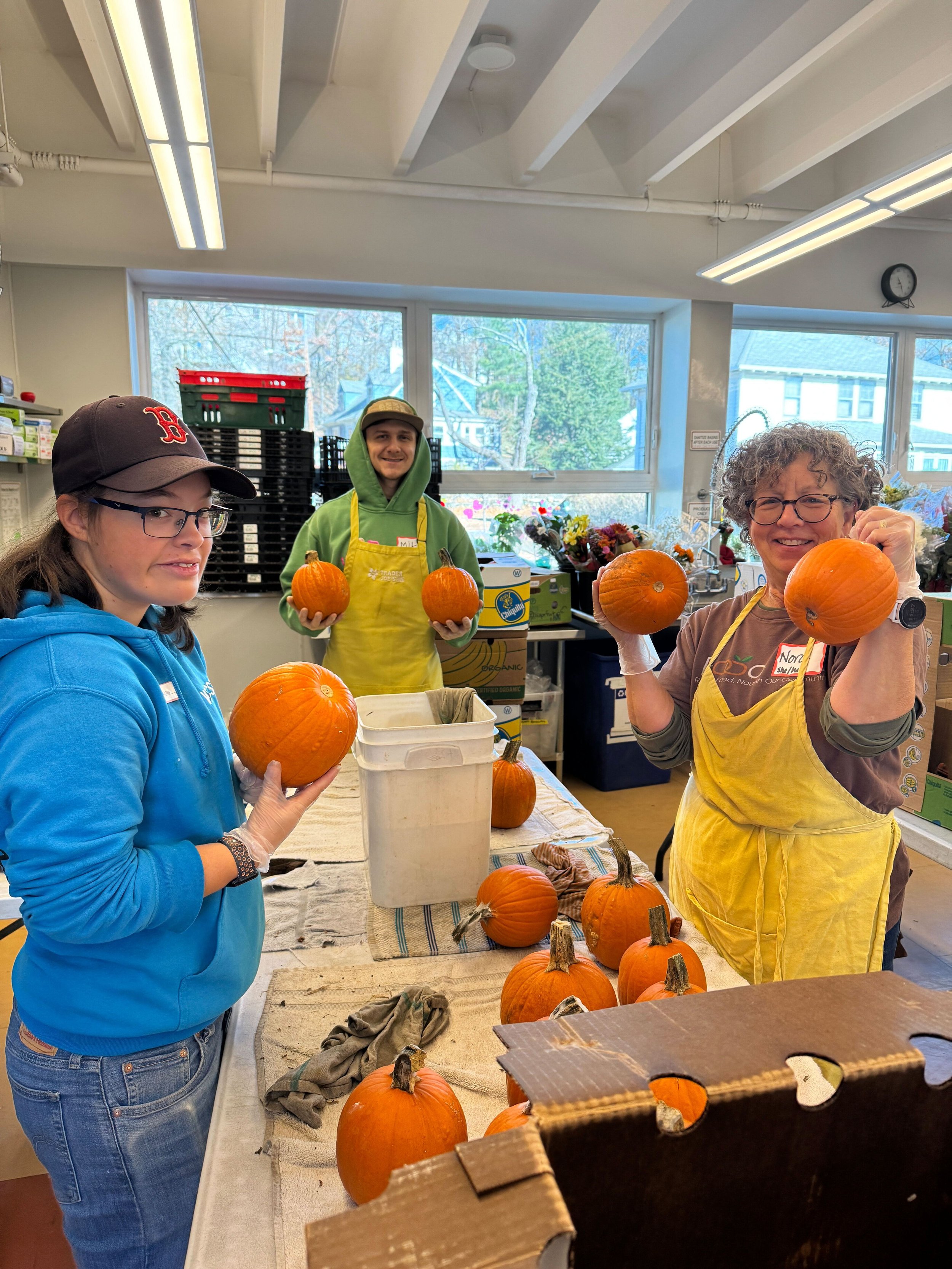 Image Description: Three volunteers hold up pumpkins at the Food Link Hub.