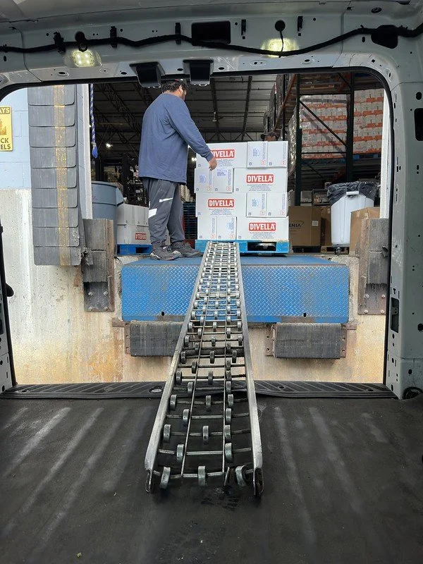 Image Description: A photo of a ladder stretching from a Food Link van compartment to a loading dock where a man stands maneuvering boxes onto the ladder. (Image Credit: Albert Lew)