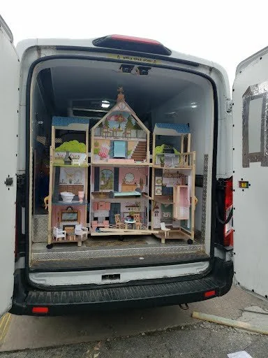 Image Description: A photo of the back of a Food Link van that holds a full-sized dollhouse. (Image Credit: Shane Bushey)
