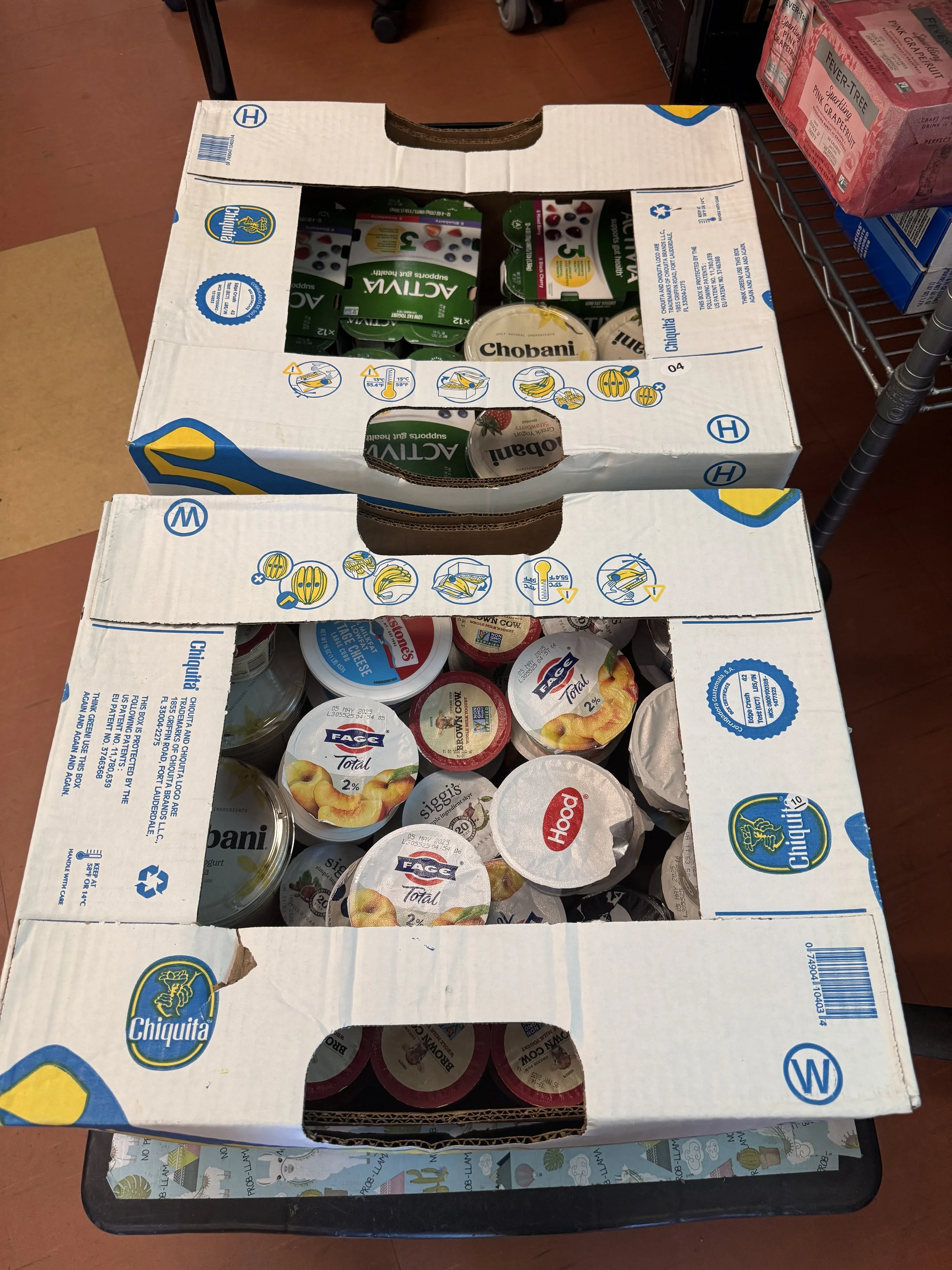 Image Description: An overhead photo of two banana boxes with various kinds of yogurt.