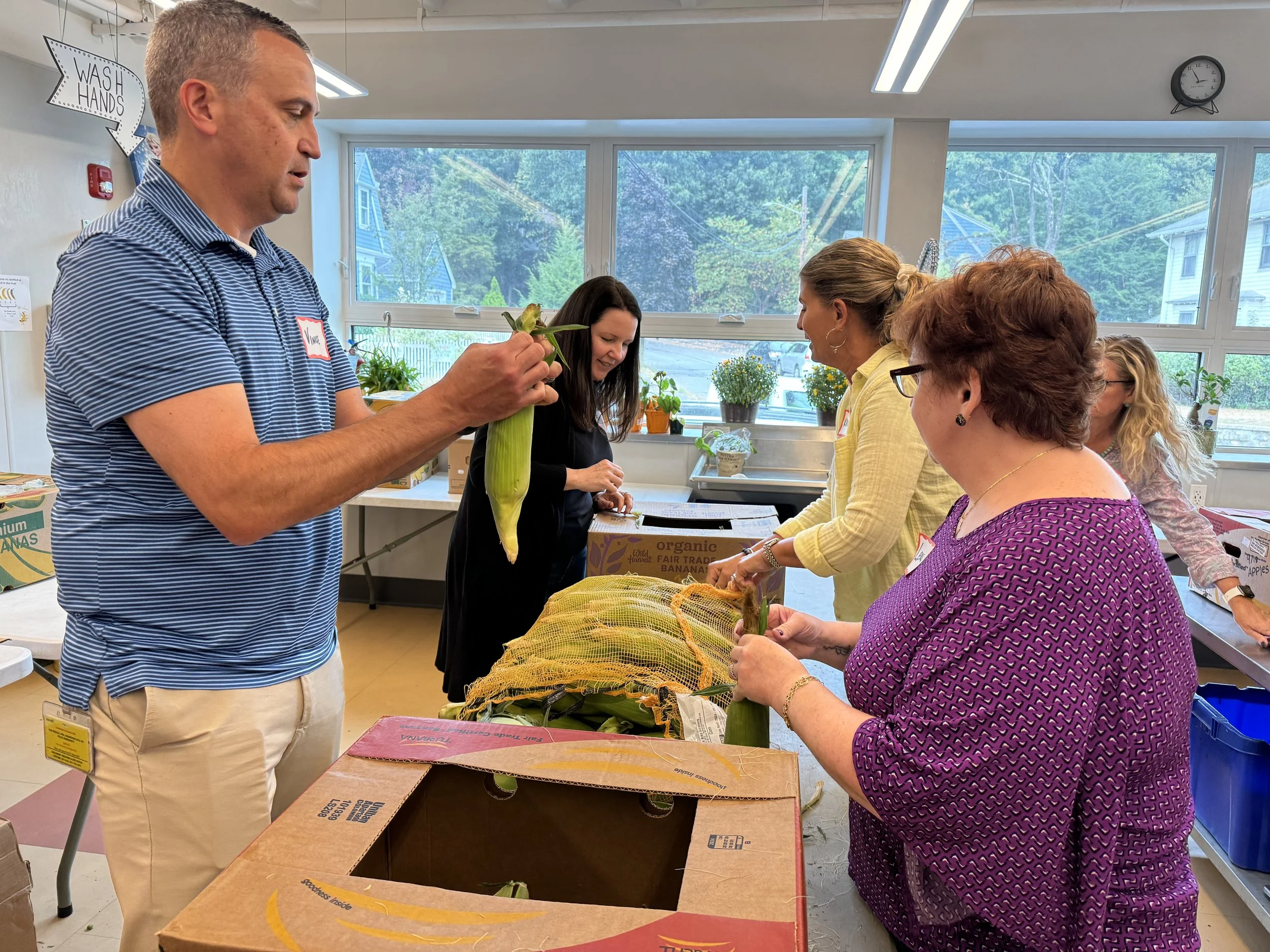 Image Description: A group of volunteers unpack corn donations in the hub.